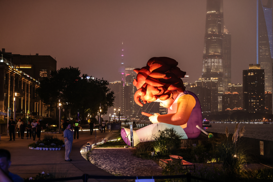 图为巨型气模作品《BY MyCellf》亮相南外滩滨江景观平台,与观众共同探讨数码依赖现象。