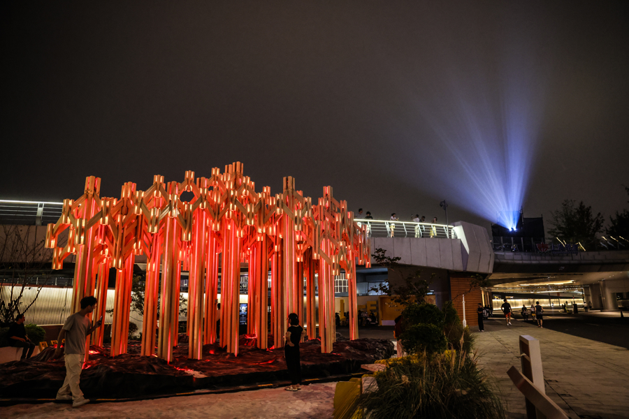 图为互动大型灯光装置《能量守护林》与滨江光影融为一体。