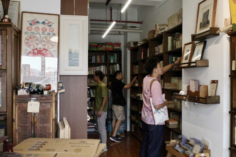 来自北京的林芳宇以及中国台湾的林昱彣正在犀牛书店选书,正巧都来上海出差的她们告诉记者,“平时看到书店就想进去逛逛,你能感觉到不同城市的气息。看到1935年的故宫日历以及1928年的《东方杂志》,都很有年代感,感觉跟店外的现代性相呼应,蛮有意思的。”